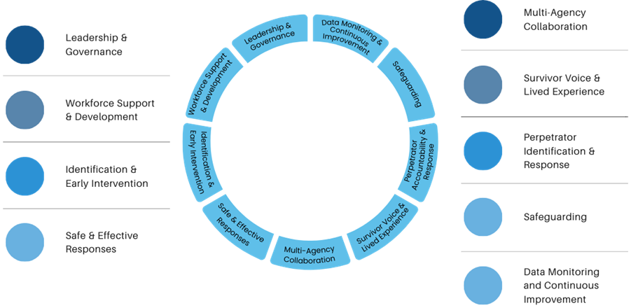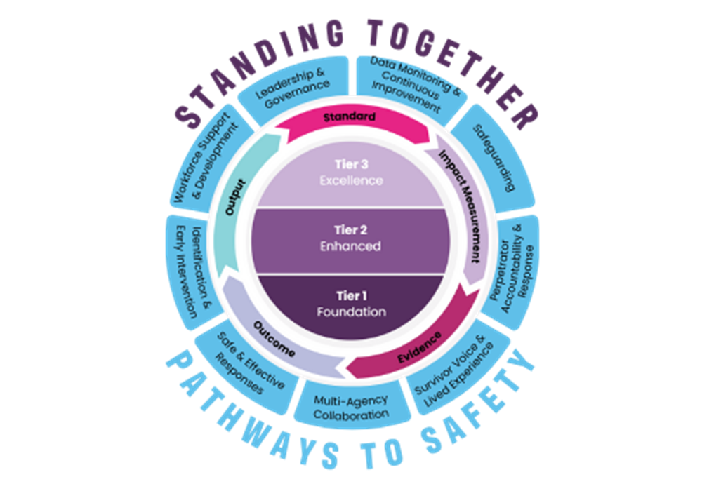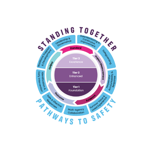 Pathways to Safety Accreditation framework includes 9 practice areas that considers an organisation's operations and delivers safe and effective interventions in domestic abuse. It builds in processes that help guide staff to adequately address the needs of survivors and hold abusers to account.